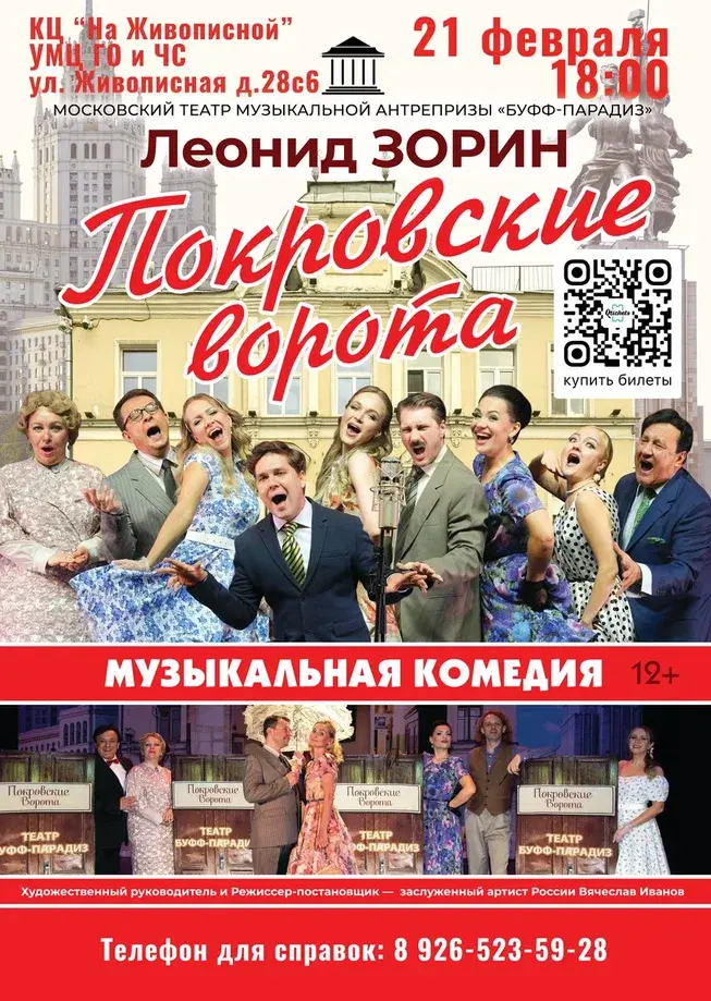 Музыкальная комедия «ПОКРОВСКИЕ ВОРОТА» это всем известная история, являющаяся теле бестселлером не одного поколения. В нашей версии этой пьесы будет много музыки и движения, но при этом сюжет останется хрестоматийным. В инсценировке этой пьесы для нас главным является сохранение атмосферы Москвы 50-60 годов. Пусть мы все моложе или значительно моложе, но у нас есть генная ностальгия и любовь к этому времени, в котором были счастливы наши отцы и деды, мамы и бабушки. У нас есть тяга к этому счастливому времени, в котором рождалась любовь наших родителей, а потом рождались и мы сами!